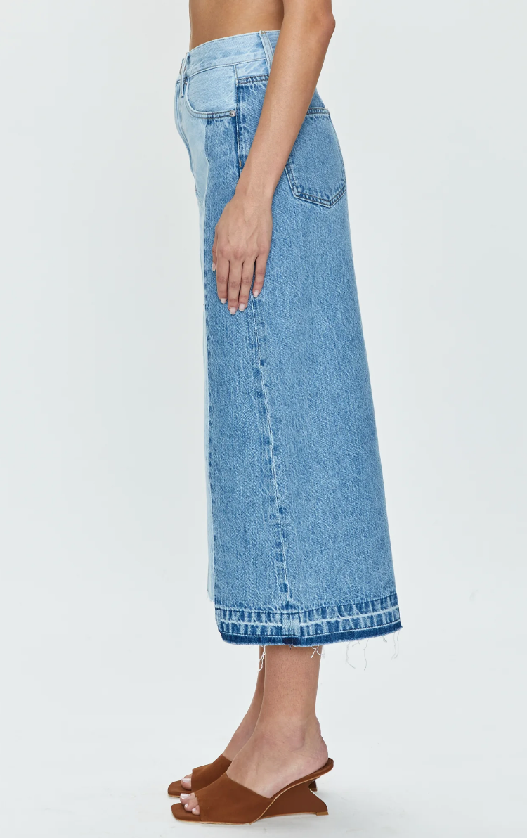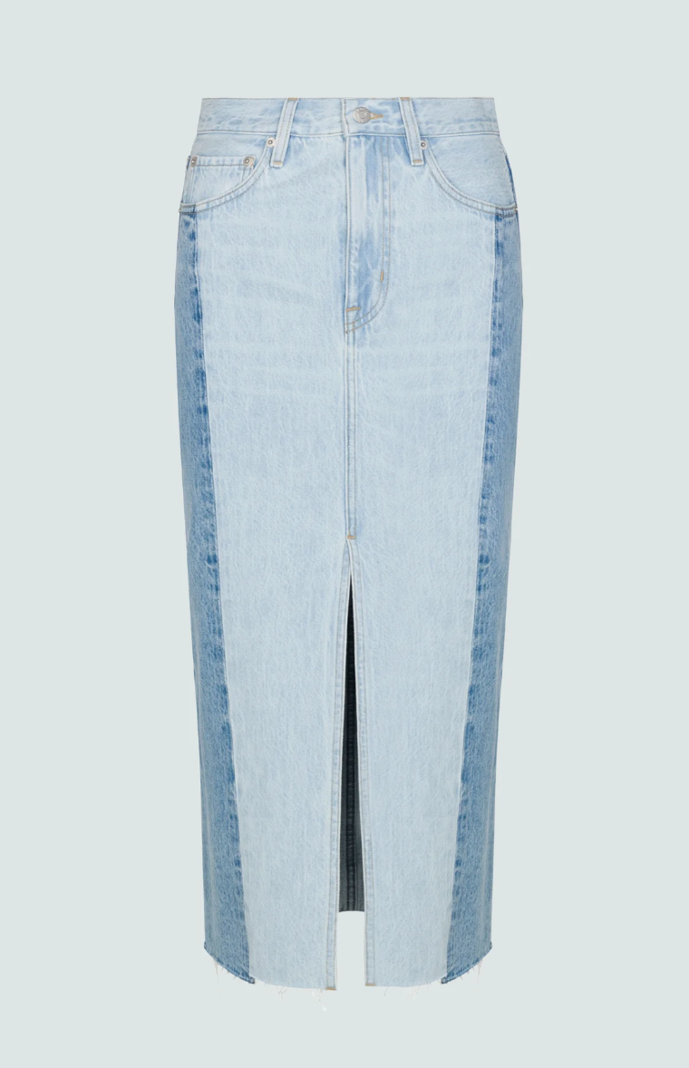 Of-the-moment, yet eternally stylish - our best selling skirt features an elongated midi length and five pocket denim design notes. Crafted from rigid denim without stretch for sophisticated fit and fall, with a well considered front skirt slit for ease of movement. Defined by its spliced denim construction, featuring a light wash front contrasted by a medium wash denim for the rear and finished with a split hem.