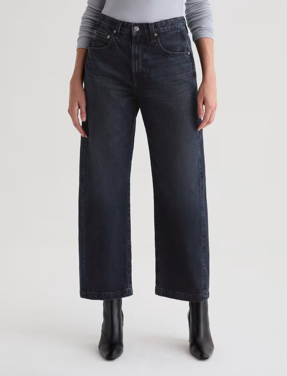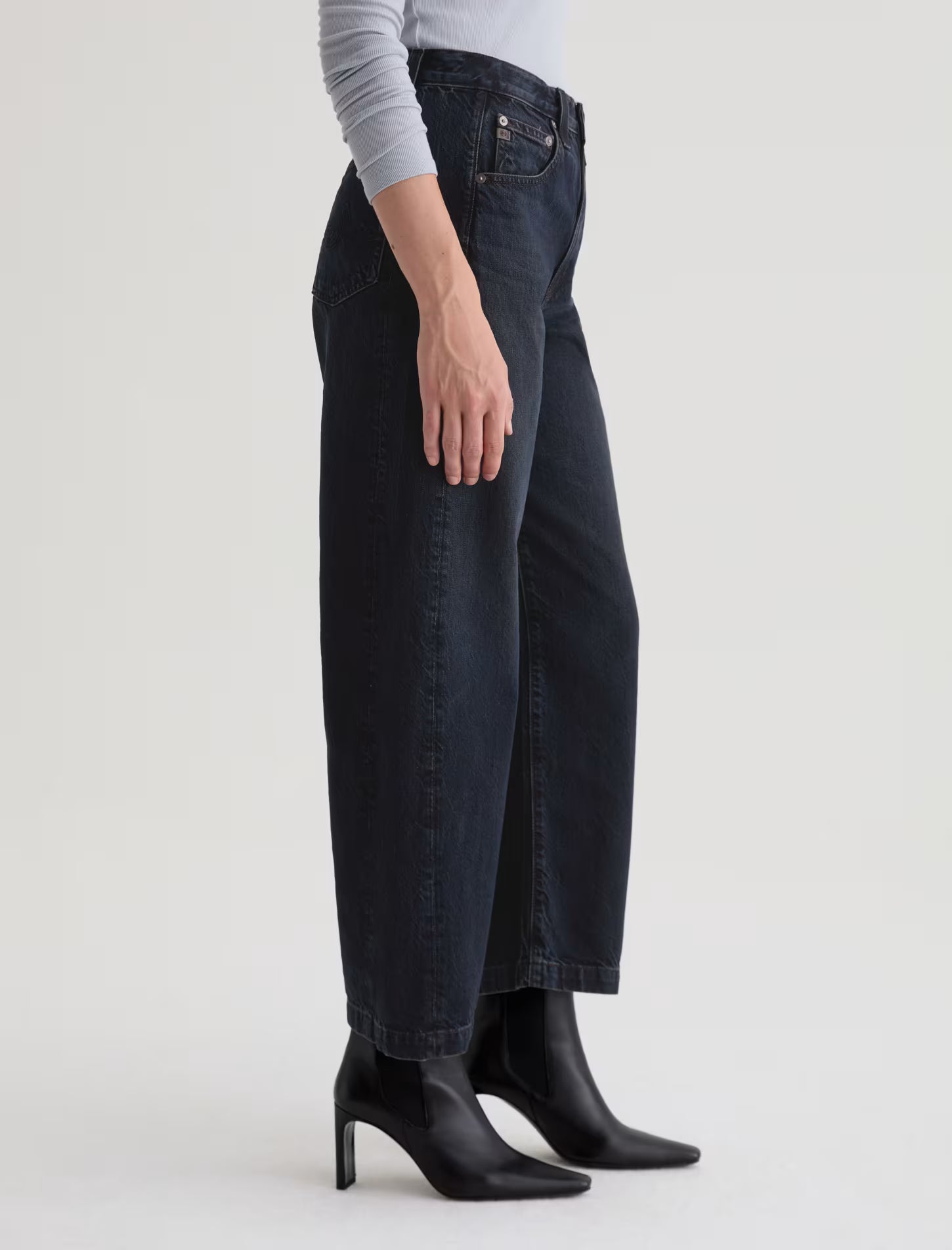 Hattie is a high-rise barrel leg with a distinctive curved silhouette and side seam paneling, cut from non-stretch denim. AG-ed™ to mimic two years of natural wear, it delivers a broken-in look with authentic character. Made from premium rigid denim by Japan’s Kaihara Mill, it offers lasting structure and shape.