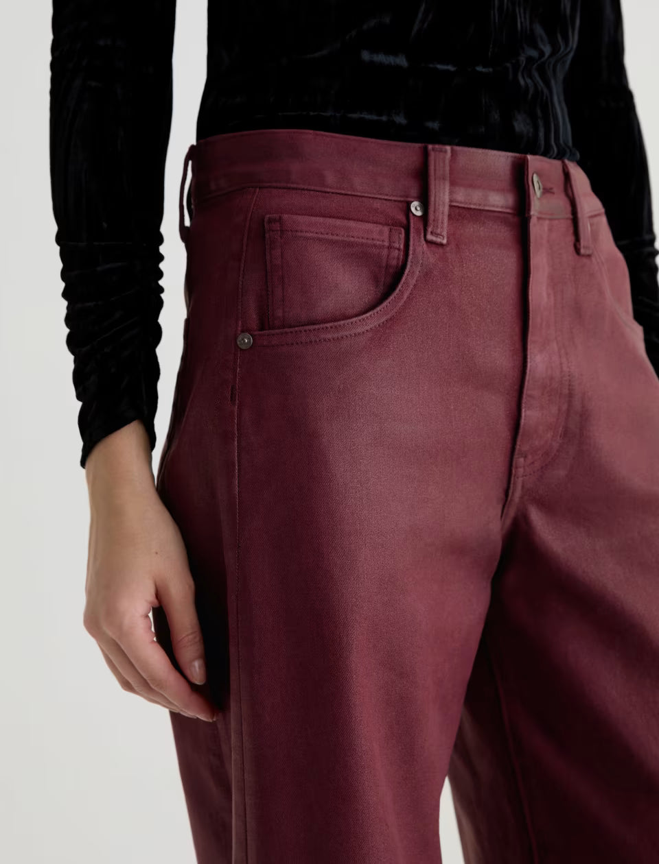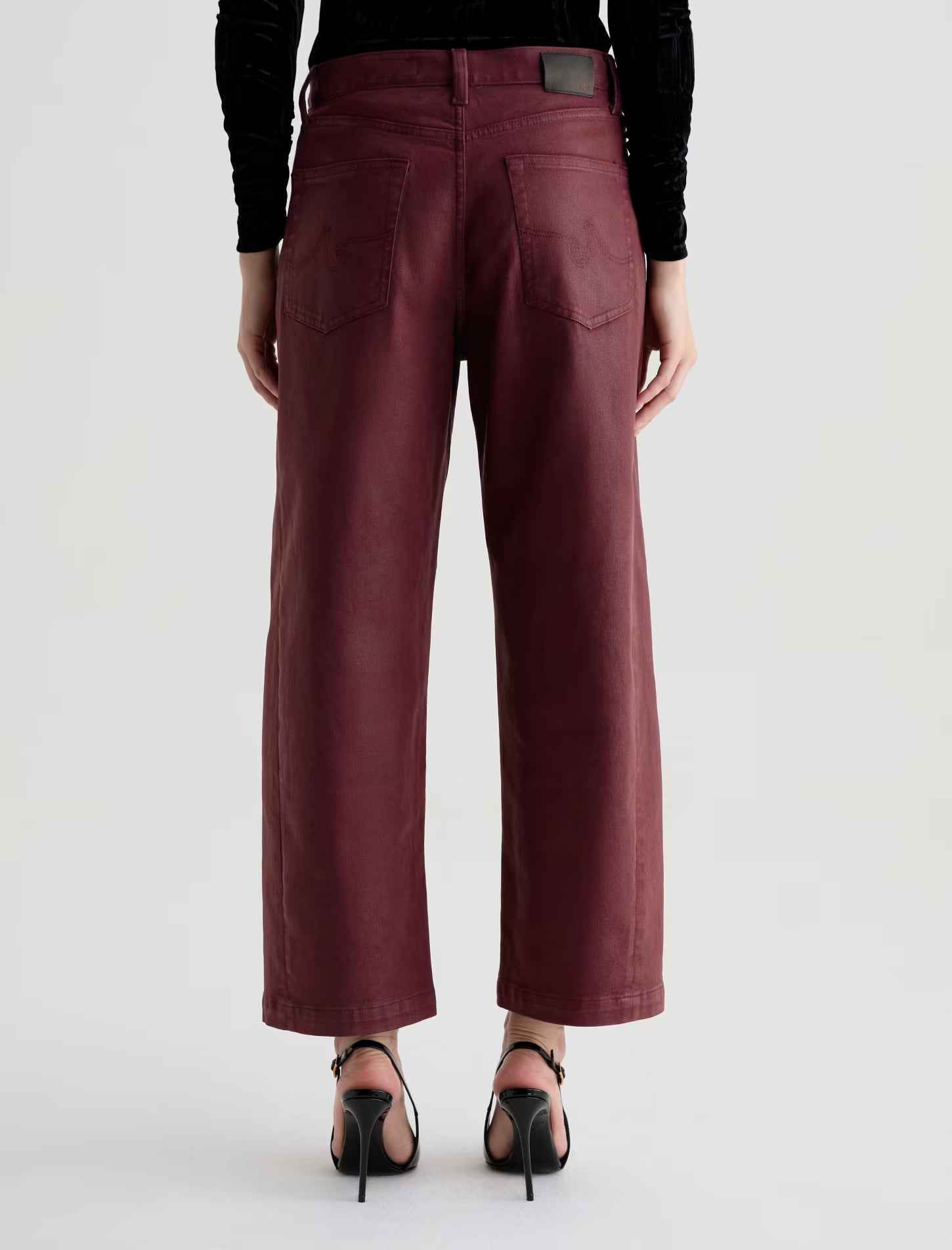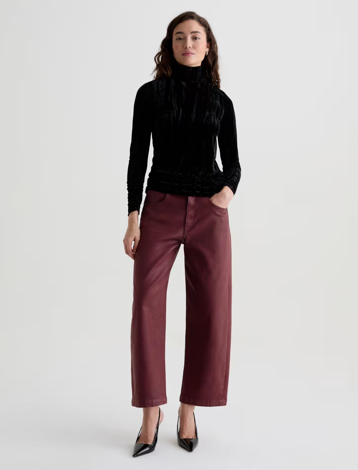 The Hattie Crop is a high-rise barrel jean with a cropped hem that hits just above the ankle for a modern, easy-to-style look. Designed with curved, voluminous legs that taper at the hem, this silhouette brings a fresh take on relaxed denim with a sheen coated finish that was hand-finished with an exclusive Leatherette process. Crafted from AG Cloud Soft Denim™, it offers all-day comfort.
