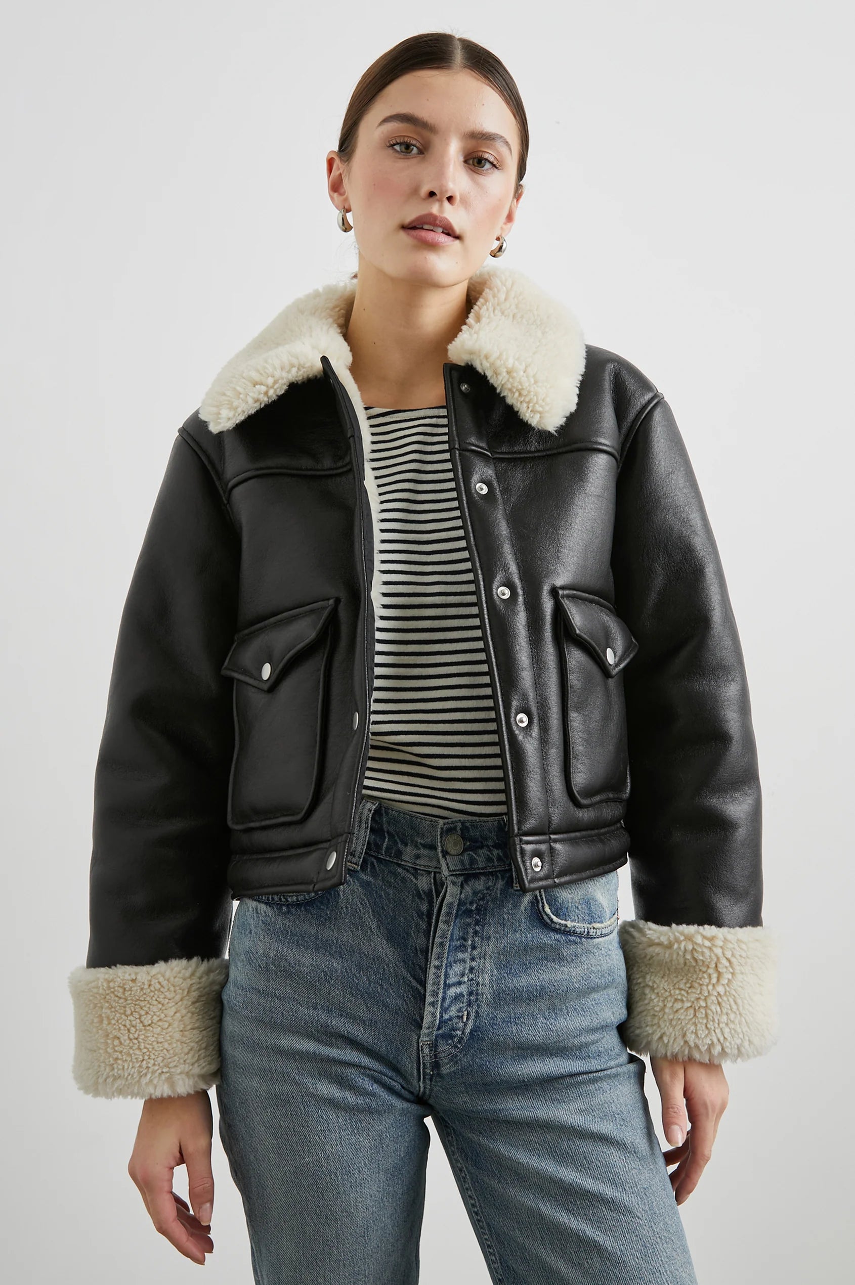 The cropped jacket that keeps you warm and looking cool. The Imani is constructed from faux leather with a shearling lining, cuffs and collar for optimum coziness during cooler temperatures. With statement (and functional) patch pockets, silver buttons and a boxy fit, this jacket is a must have.