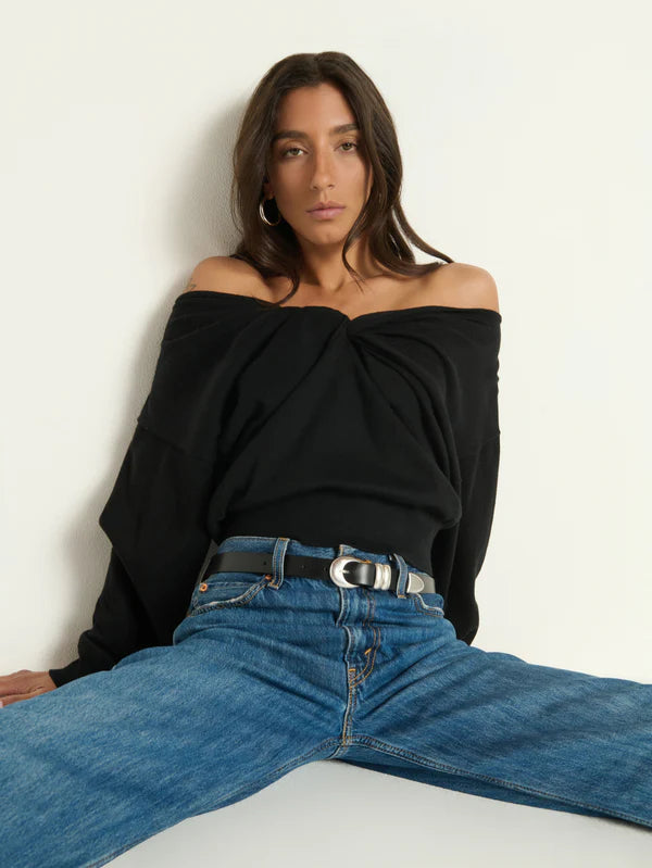 This cashmere cotton blend is a true cozy staple in every collection. Features include a drop shoulder, ribbing at the sleeves and waist for structure, and a gathered, knotted neckline. This one comes in Jet Black.
