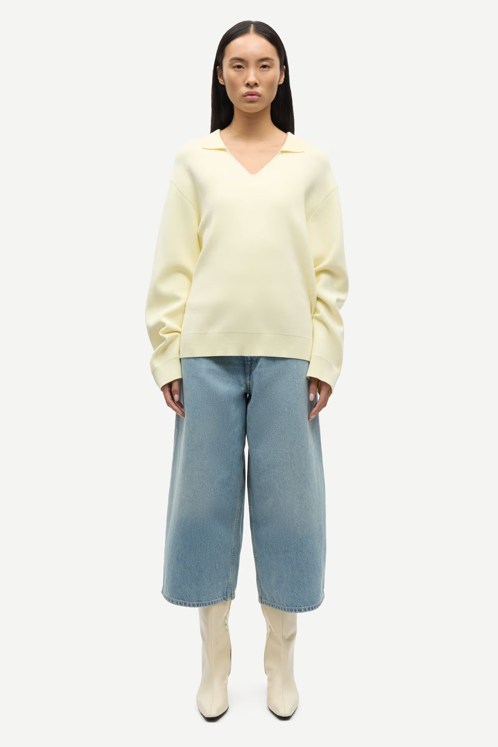 Sweater with a regular fit and dropped shoulders. Polo collar, rib-knitted cuffs and hem. V-neck. Striped pattern. Main material made from an elastic blend including LENZING™ ECOVERO™ Viscose.